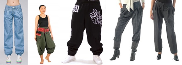 Baggy.- Pantalones bombachos, anchos en la cadera y piernas, y ajustados en los tobillos.