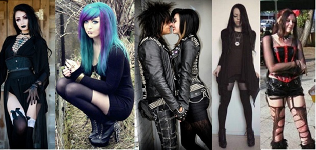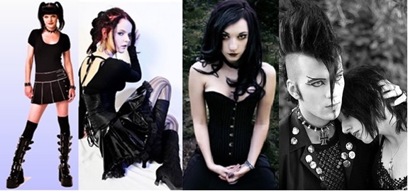 Estilo Gótico/Dark/Darketo.- (siniestro, oscuro, batcaver). Después de la desaparición del post-punk, el gótico continuó evolucionando, tomando influencias del death rock, el punk, el estilo andrógino, y hasta el estilo de vestimenta del renacimiento o de la época victoriana; sin embargo, los góticos tienen una estética propia, que se centra en el color negro: trajes negros y maquillaje para resaltar. Se caracteriza por una imagen siniestra, andrógina y oscura. Sus prendas y accesorios fetiche son: pantalones pitillo, corsés, cazadoras, camisas con chorreras (volantes), leggins, botas altas con cordones, ligueros, cadenas y collares con picos, prendas de cuero, latex, PVC, vinilo, encaje, satén, tul y angora, siempre el color negro con pequeños toques en rojo, púrpura y granate, y adornos de cruces, calaveras, símbolos egipcios y telas de araña.