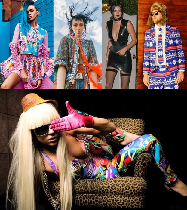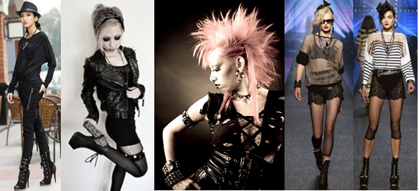 Estilo Punk/Punketo.- Una subcultura cuya ideología es el anarquismo, el anticapitalismo, el antimilitarismo, el antirracismo y el antifascismo, que creó una estética, contraria a la moda hippie: cabellos cortos y teñidos, maquillaje a su máxima expresión y prendas estructuradas y elaboradas con elementos que sugerían rebelión a lo establecido, camisetas intencionalmente ofensivas, con elementos como crucifijos invertidos y suásticas nazis, que, como muchas otras prendas punk, eran desgarradas a propósito. Incluían medias de red, bandas con picos y clavos, joyería de piel con remaches, broches de seguridad en la ropa y en la piel, un fuerte delineador tanto en hombres como mujeres. Las chicas punk se rebelaron a una imagen femenina, combinando prendas delicadas con elementos considerados como masculinos, como lo eran las botas industriales; prevalecían el cuero y la mezclilla, el plástico y el vinilo.