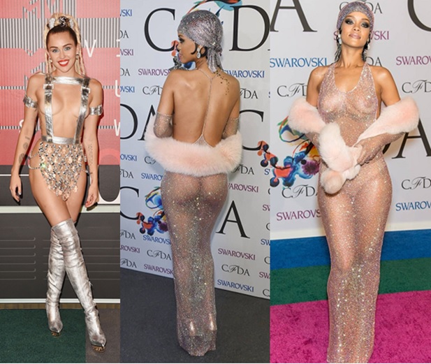 Naked dress.- Moda que muestra –semidesnudas– principalmente a artistas y modelos. (Miley Cyrus, Rihana)