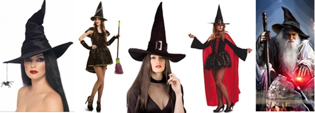 Bruja(o).- La imagen típica de un brujo o de una bruja, es muy variable en función de cada cultura; en el acervo popular del mundo occidental, la representación de una bruja se asocia fuertemente hoy en día, a la de una mujer con capacidad de volar montada en una escoba, con un sombrero de pico, así como con el Aquelarre (lugar de brujas) y con la caza de brujas. La bruja es un personaje recurrente de la imaginación contemporánea, que perdura y se afirma gracias a los cuentos, las novelas, las películas, así como a través de ciertas fiestas populares y de sus especiales máscaras y sombreros.