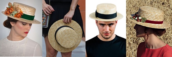 Canotier.- Se trata de un sombrero muy elaborado, hecho con paja trenzada. Se cosían las tres partes del sombrero: tapa, copa y ala por separado y después, se unían con caucho. Se solía adornar con una cinta negra o de color azul o de rayas, que a menudo representan una escuela, una tripulación de remo o una institución.