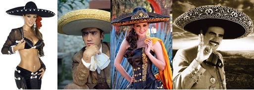 Charro.- El verdadero sombrero de charro es de ala ancha, levantado de la parte posterior; lleva en la copa cuatro «pedradas» que le dan resistencia en caso de impacto. Son usados con mayor profusión por los mariachis y cantantes de música vernácula mexicana y aquellos que practican la charrería, que está considerada como el deporte nacional en México. Está hecho de fieltro de lana, de pelo de liebre o de paja de trigo.