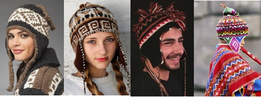 Gorra Chullo.- Es una gorra con orejeras, tejida en lana de alpaca u otros animales, en combinación con fibras sintéticas. Es originaria del altiplano andino del Perú. Expandida también en Chile, Bolivia, Argentina y Ecuador, donde se le usa para protegerse del inclemente frío. Según el historiador tacneño Arturo Jiménez Borja, el chullo andino tiene su origen en el birrete español y el mestizaje cultural le añadió orejeras, borlas, y diseño autóctono. En su mayoría están hechos de lana de alpaca o vicuña, aunque los hay también de algodón, tela y lana simple.
