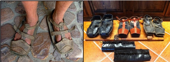 Albarca/Abarca.- Calzado rústico elaborado principalmente en cuero crudo, que cubre solamente la planta de los pies, y se asegura con cuerdas o correas sobre el empeine y el tobillo. También son confeccionados con otros materiales como madera, neumáticos usados, plásticos y otros materiales.