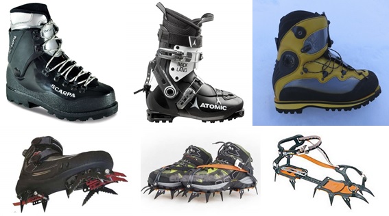 Alpinismo/Montañismo.- Se trata de la disciplina, en general deportiva o recreativa, que consiste en la realización del ascenso y descenso de montañas. En calzado, lo más común son unas botas cortas con el fin que protejan de las torceduras de tobillos, con suela antideslizante y que sean cómodas. Incluye también calcetines adecuados a la época del año y polainas, si fuera necesario. En climas muy fríos se prefieren los materiales sintéticos pues el cuero suele resquebrajarse. Para escalada en nieve o hielo, se les pueden poner crampones (spikes) que son unos dispositivos metálicos de tracción que se colocan en la suela de determinados tipos de botas, para posibilitar o mejorar la adherencia de éstas, a superficies heladas o nevadas.