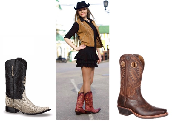 Botas vaqueras.- Son especialmente hechas de pieles o cueros exóticos, como la avestruz o serpiente. En México es común calzar esta bota y ha adquirido influencia en la cultura (no confundir con la bota charra); esta bota tiene en el tacón un ajusté para espuelas en forma de broche y no necesariamente es de cuero, de hecho lleva una combinación de tela, metal, cuero, y sus diseño es muy resaltando. De los componentes que son de observarse en estas botas, es la punta puntiaguda, o semi-puntiaguda, la cual puede o no llevar casquillo. Los tacones también son distintivos, pues estos pueden llevar una inclinación interna, unas más pronunciadas que otras.