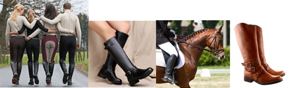 Las botas ecuestres son botas largas, ajustadas al cuerpo del jinete, con un tacón elevado, para que no quedar enganchado, si el pie se resbala, y sin cordones. Que cuenten con el sitio reservado para el estribo (donde el jinete introduce los pies, para afianzarse mientras cabalga). Normalmente suelen utilizarse botas de piel o de caucho. Dado que en las cuadras y pistas siempre se encuentra agua, barro, estiércol o arena húmeda, así como terrenos resbaladizos y húmedos, es aconsejable que las botas de equitación tengan suela de goma adherente. Para los días de lluvia, existen botas de equitación de agua, y para el invierno hay botas con forro, así como botas invernales, con elevada protección térmica, para inviernos duros.