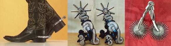 Espuelas.- Son espigas metálicas que se colocan en el talón de las botas de quien cabalga, con el propósito de azuzar, y dirigir los movimientos del caballo. Son utilizadas en todas las disciplinas ecuestres y existen reglas en su diseño y uso, para evitar que se constituya cualquier tipo de abuso contra los animales. Las espuelas se componen básicamente de un arco o cuerpo, que es la parte curva para ajustar el talón, las piernas que son las partes que van a cada costado del pie; la rodaja, que es la parte para espolear al caballo, y el pigüelo o pihuelo, que es la parte donde se sujetan y giran las rodajas.