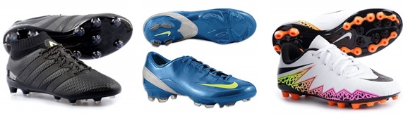 Los jugadores calzan zapatos de fútbol, que pueden estar hechos de cuero o de materiales sintéticos, como el poliuretano. Las botas modernas están ligeramente cortadas bajo los tobillos, en contraposición a las altas botas de décadas pasadas, y tienen tacos o tapones, insertados en las suelas. Hay tacos de tres tipos: caucho, hierro y aluminio, para distintos tipos de terreno. Estos pueden ser parte fija de la suela, pero existen igualmente versiones en las que se pueden retirar con un destornillador. Su cantidad y distribución deben amoldarse a las características del terreno. Como regla general, a mayor número de tacos, menor adherencia y por tanto menor posibilidad de sufrir una lesión, en terrenos blandos.