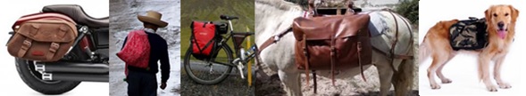 Alforja.- Las alforjas están íntimamente relacionadas con los bolsos ya que aquéllas son las antecesoras de estos. Las alforjas se diferencian en que eran unos sacos de tela cortos y anchos y con forma cuadrada, con una solapa en su abertura superior, usados para transportar cerámica, alimentos y objetos pesados. También fueron usadas tradicionalmente, desde la antigüedad, como complemento asociado a las caballerías (burros, mulas, caballos, etcétera). Por extensión se llama así a las bolsas sujetas a la silla o asiento que se usan en motocicletas y bicicletas, para llevar equipaje.