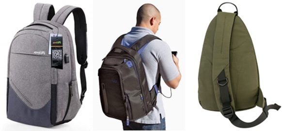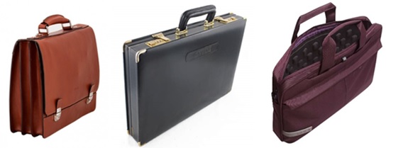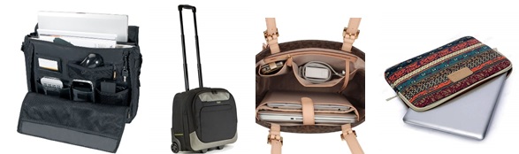 Laptop.- Bolso que permite transportar una computadora laptop. Puede ser tan sencillo que apenas cabe dicho dispositivo, para su protección, o más grande para transportar sus accesorios (cargador, cables, mouse, candado, USBs, CDs, DVDs, etcétera), y hasta elementos de trabajo como papelería, bolígrafos, celular, tableta y demás. Su forma para transportarlo puede ser cualquiera conocida: asas, correa para colgar al hombro, tipo Backpack, con ruedas y asa telescópica, etcétera.
