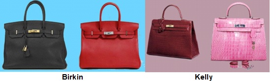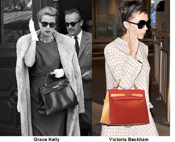 Birkin/Kelly.- Ambos son de Hermès©, y son los bolsos más deseados del mundo; los dos tienen muchas características en común, tantas que hasta son confundidos muchas veces. La diferencia más notable es el tamaño, el Birkin es más grande que el Kelly, pero curiosamente parece que el bolso Kelly original, era bastante grande, tanto que servía para guardar las sillas de montar y accesorios del jinete y se llamó «Aut à Courroies»; basándose en este modelo, a los 30 años se creó su versión reducida como bolso de mano, y gracias a llevarlo Grace Kelly y lucirlo en la portada de la revista Life, en 1950, tuvo tanto éxito que pasó a llamarse «bolso Kelly». La «celebritie» que más lo luce es Victoria Beckham, que es una apasionada, tanto del Kelly como del Birkin, y parece que tiene en todos los colores.