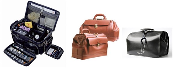 Médico/Cabás.- Clásico maletín que utilizan los médicos, cuando tienen que trasladarse fuera del consultorio u hospital, por ejemplo, para una atención a domicilio, donde llevar instrumental, recetario, medicamentos, jeringas, etcétera. También para transportar su propio instrumental a los hospitales. Puede ser tan grande como sea necesario.